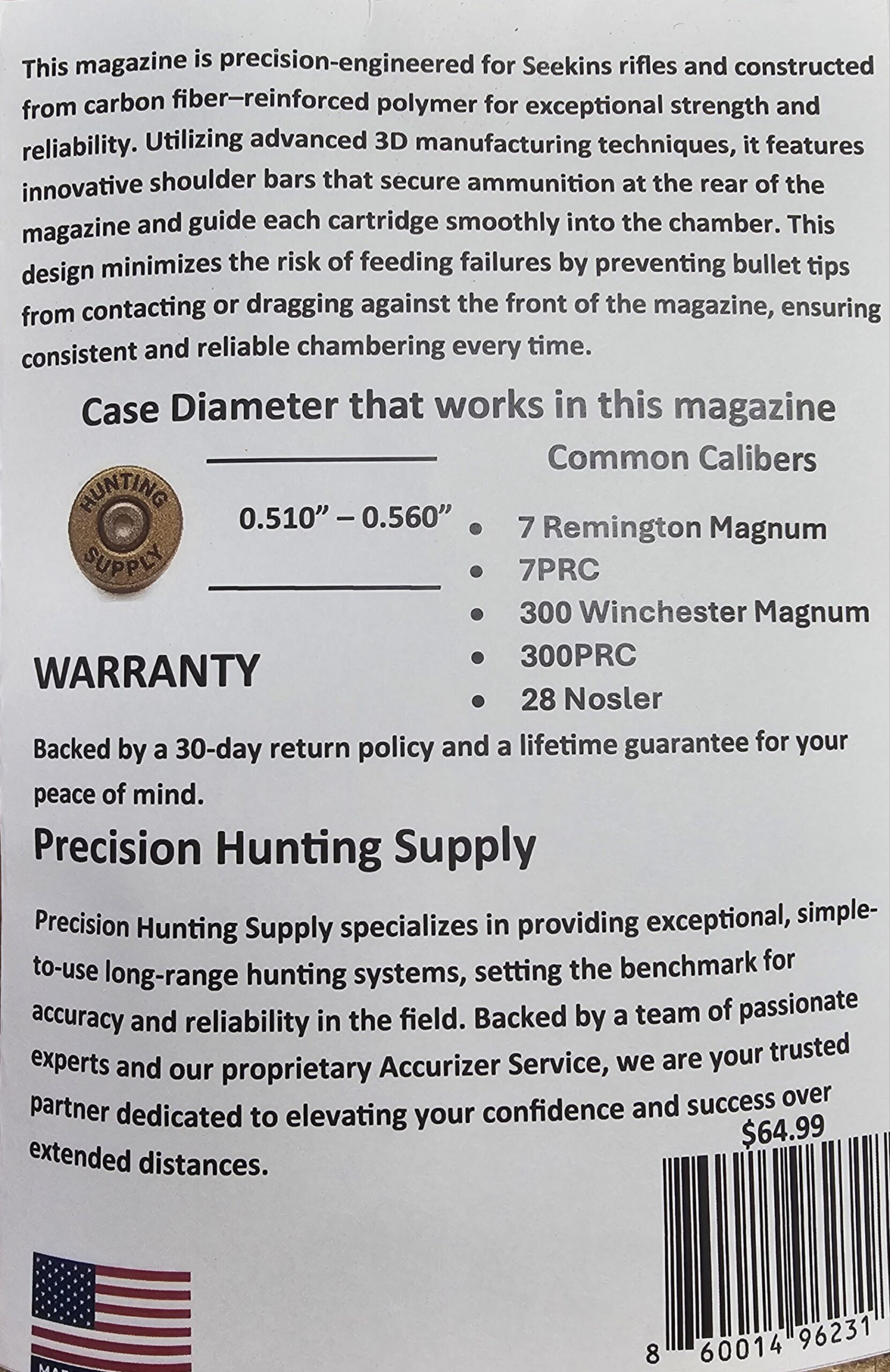 Crafted from carbon fiber-reinforced polymer, this magazine is built for strength and reliability. It’s designed to maintain ammunition at the rear of the magazine, ensuring consistent and dependable chamber loading every time. These fit Seekins Havak rifles, including the M3 Element, PH2 / PH3 and Element Hunter.
